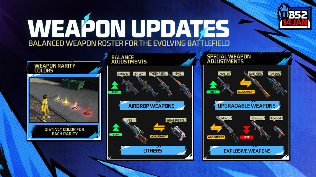 - Upgraded Arsenal weapons are changed to: Groza (infinite ammo), AWM (infinite ammo), Thompson (infinite ammo), FAMAS, Charge Buster, M79 on the middle racks. Side racks may hang: Kar98k, FAMAS, M60-III, Winchester-III, M4A1-III, SCAR-III, MP5-III.