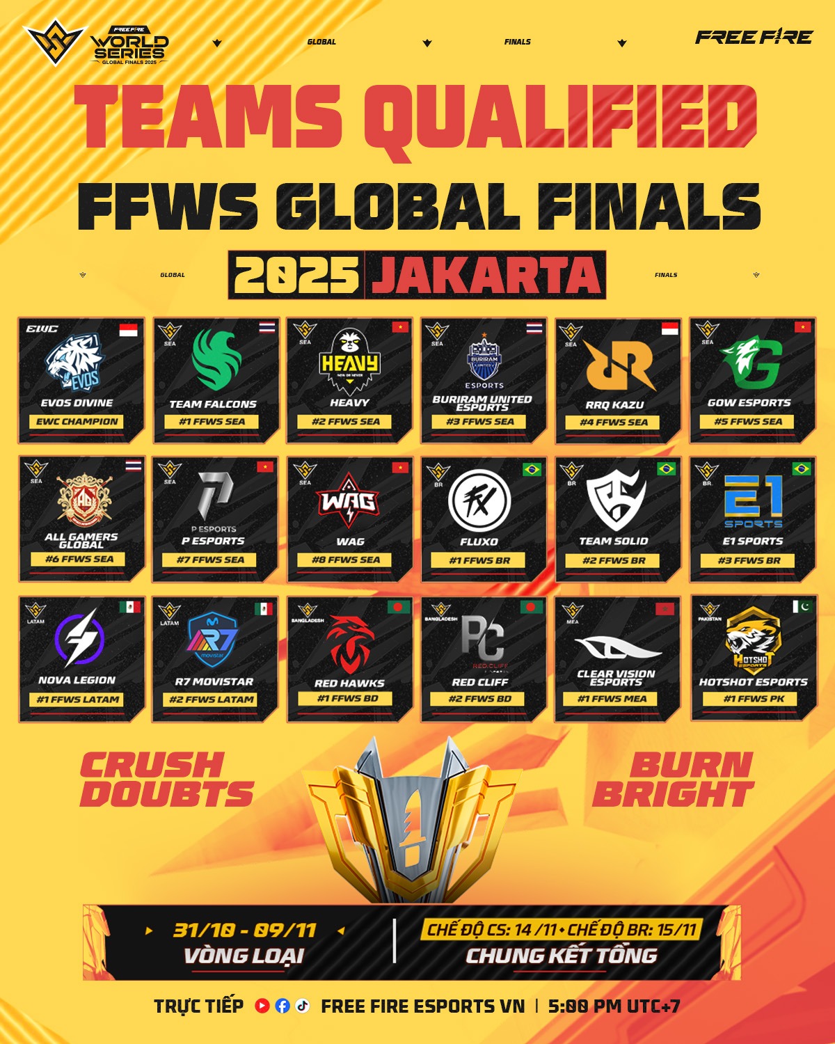 Đấu Trường Rực Lửa sẽ chính thức ra mắt vào ngày 29/10, cùng thời điểm diễn ra Chung kết Thế giới Free Fire 2025 từ 31/10 đến 15/11 tại Jakarta, Indonesia. Tại đây, 18 đội tuyển Free Fire xuất sắc nhất thế giới sẽ cùng tranh tài qua hai giai đoạn thi đấu, với tổng giá trị giải thưởng lên tới 1,15 triệu USD.