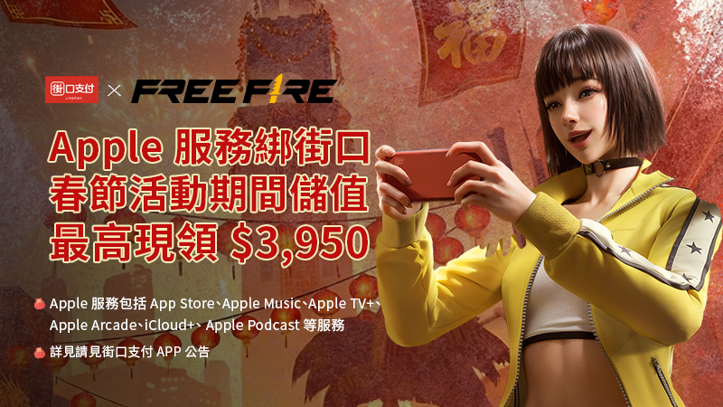 街口新戶於註冊時輸入推薦碼「FREEFIRE26」,即可獲得 Apple 服務五折券(每人折抵上限 200 元,不限折抵次數)。用戶需綁定街口支付至 Apple 帳戶後,於 Garena 遊戲內或其他 Apple 服務的消費皆可使用此優惠。